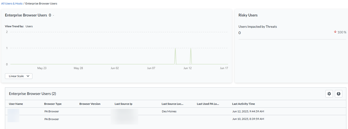 In Strata Cloud Manager, go to InsightsActivity InsightsUsers to view information about your Prisma Access Agent