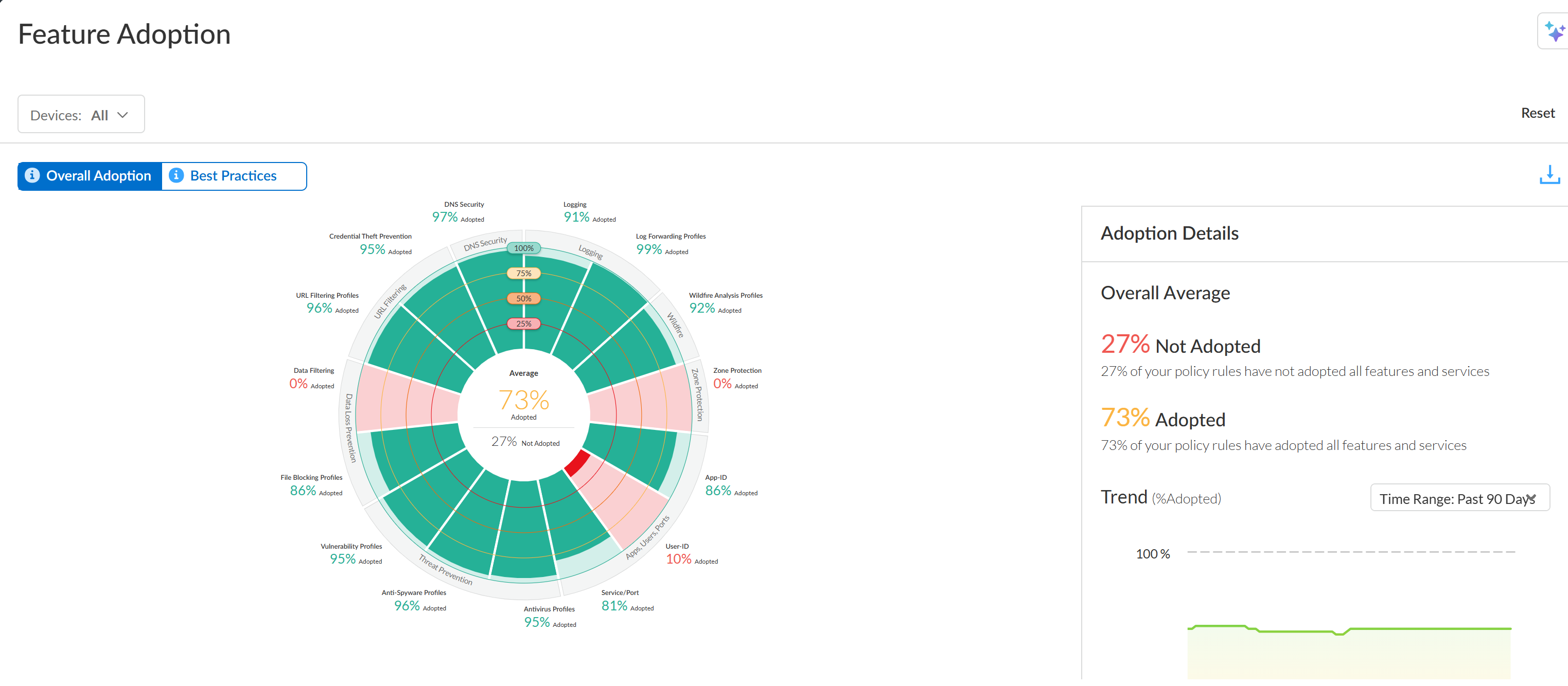 - To focus on the feature adoption for a specific set of firewalls, you can filter the chart based on device group, including Panorama-managed devices. You can also see historical adoption trend charts.