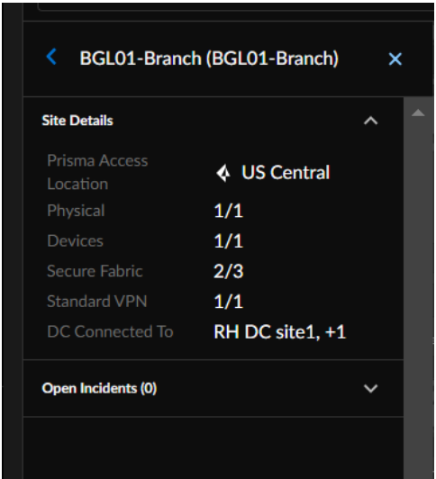 sites and data centers connected to Prisma Access Remote Networks and provides detailed