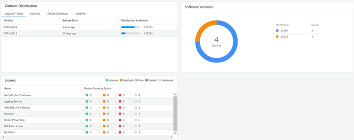 - For details on your managed firewalls:- Review Content Distribution and Software Versions details to see which dynamic content updates and PAN-OS software versions are running on your managed firewalls.