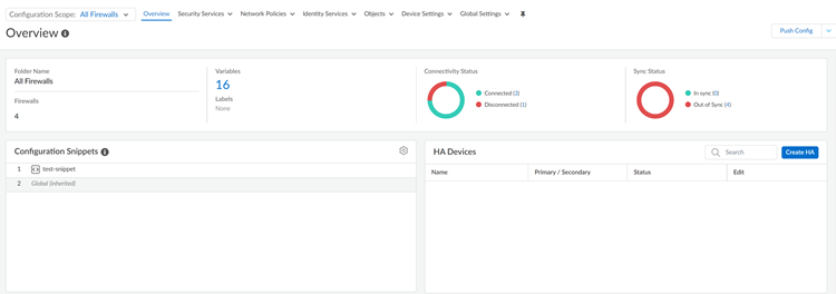 - SnippetsUse snippets to group configurations that you can quickly push to your firewalls or deployments.
