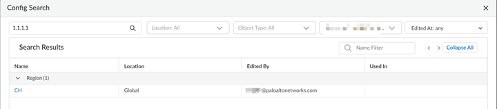 - Config Search is available for each field that’s searchable. For example, you can search on the following object types for a Security policy: Tags, Zone, Address, User, HIP Profile, Application, UUID, and Service.