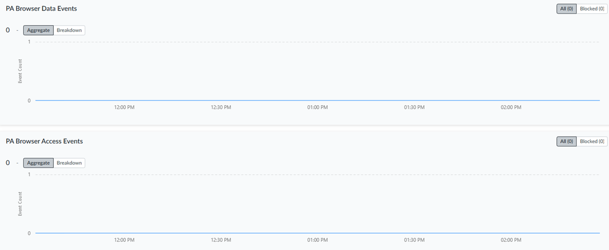 - The following image shows Application Details about PA Browser Data Events and PA Browser Access Events. The default view shows an Aggregate of all events and blocked events, or you can choose to view a Breakdown by Event Type and Count.![]()