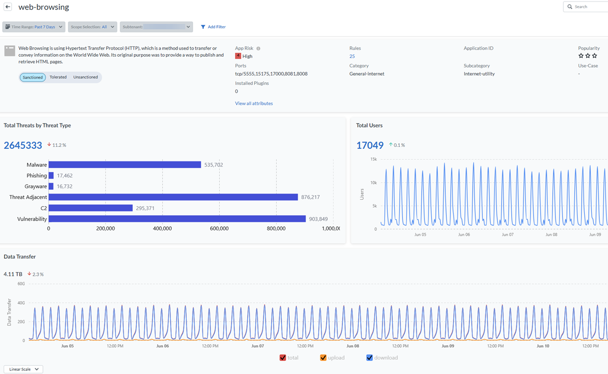 - Application Details—Select any application in the All Applications table to view general details of the application along with details concerning application activity and application experience.![]()  - About the app—View whether the application you selected is tagged as Sanctioned, Tolerated, or Unsanctioned.