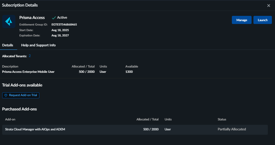 • Purchased Add-Ons – Lists all purchased add-ons along with their activation status and license allocation.