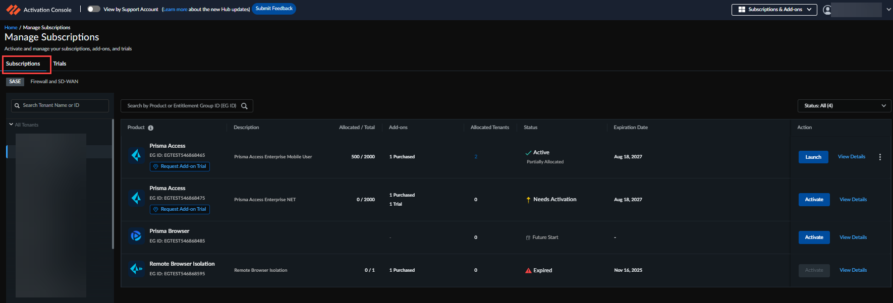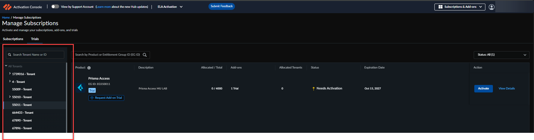 The Subscriptions and Trial tabs provide a centralized view of all product entitlements associated with the selected tenant, enabling customers to monitor, manage, and activate both purchased and trial products efficiently.