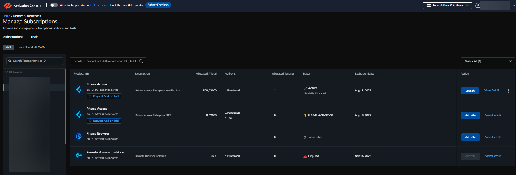 The SASE tab displays all SASE products associated with the tenant, including both activated products and those pending activation. You can activate these products directly from the Activation Console. Currently, the Activation Console supports activation only for SASE products.