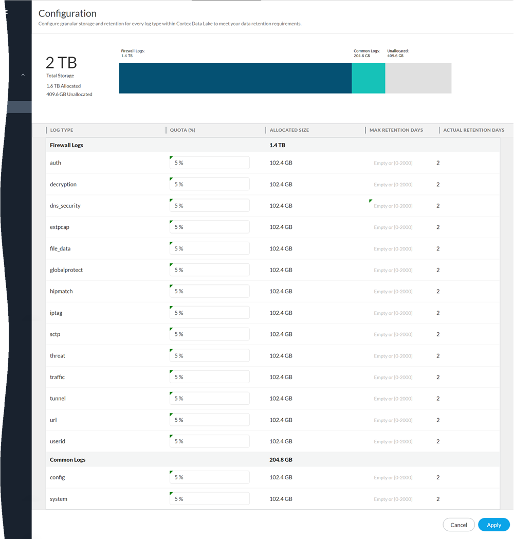 Field Value QUOTA (%) (Optional) The percentage of your total Strata Logging Service capacity that you want to allocate for each log type.Setting QUOTA for a log type to 0% means that Strata Logging Service does not store the logs. If you reset QUOTA to 0%, all existing logs will be deleted.Leave this field blank to allocate all remaining storage to a log type. If you leave this field blank for multiple log types, they all share the remaining unallocated storage. When no more unallocated storage remains, Strata Logging Service deletes the oldest logs among the log types with this field empty.ALLOCATED SIZE (Read-only) The amount of log storage space allocated for each log type in KB, MB, GB, or TB.MAX RETENTION DAYS (Optional) The number of days that Strata Logging Service retains logs. Set this value only if you have a company or regulatory retention policy that requires you to delete logs after a given time period. If you leave this field blank, Strata Logging Service will not delete logs until the available storage space runs out.When a log type reaches its max retention days, Strata Logging Service deletes the oldest logs of that type.Setting MAX RETENTION DAYS for a log type to 0 means that Strata Logging Service does not store the logs. If you set MAX RETENTION DAYS to 0, all existing logs will be deleted.ACTUAL RETENTION DAYS (Read-only) The number of days that logs have been stored in Strata Logging Service. Logs are rolled over when the max days is reached or the available storage space runs out. Use this information to learn about the current utilization of Strata Logging Service or which logs it has retained the longest and assess if you need to reallocate quota to meet your log retention policy. You can toggle whether to store or ingest log data from individual firewalls in the Inventory tab.Apply your changes.