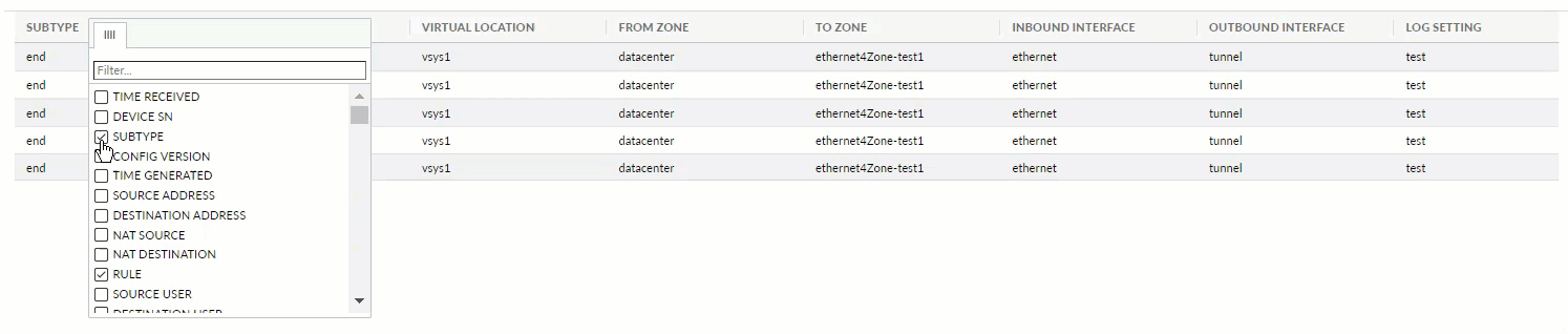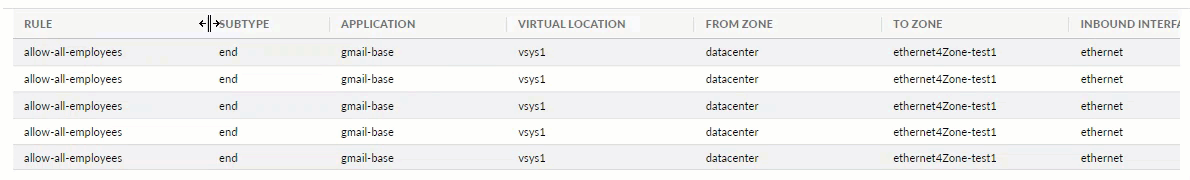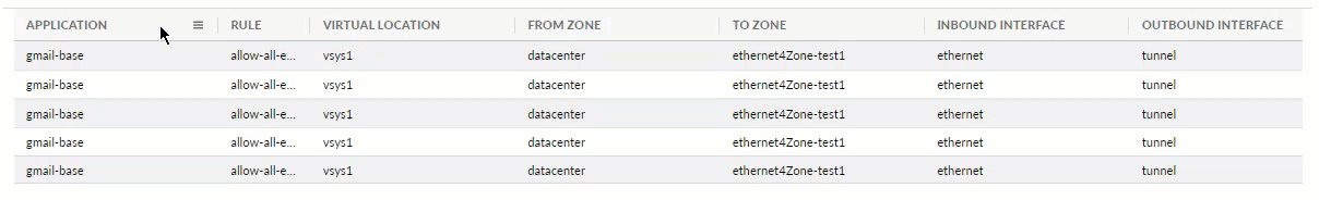 Rearranging columns changes the order of the fields in the Syslog message of the logs forwarded through the filter. For example, if you move RULE to the left of APPLICATION, the Rule field will appear before the Application field in the Syslog message. - Change column width by clicking in between column headers and dragging to the left or right.