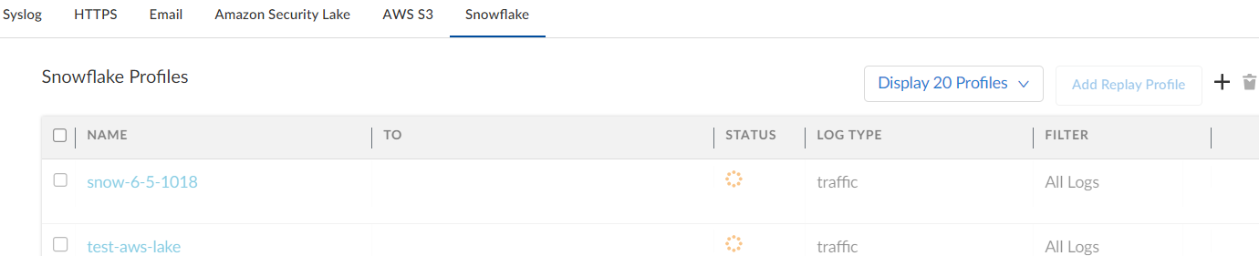 - Log in to the Snowflake account with the ACCOUNTADMIN role.Run the following script in the Snowsight worksheet:CREATE WAREHOUSE IF NOT EXISTS SLS_WH; CREATE DATABASE IF NOT EXISTS SLS_DB; USE SCHEMA SLS_DB.PUBLIC; CREATE OR REPLACE ROLE SLS_ROLE; CREATE OR REPLACE USER SLS_USER LOGIN_NAME='<username' PASSWORD='<password>' DISPLAY_NAME='SLS Event Forwarding' DEFAULT_WAREHOUSE = SLS_WH DEFAULT_ROLE = SLS_ROLE; GRANT USAGE ON WAREHOUSE SLS_WH TO ROLE SLS_ROLE; GRANT USAGE ON DATABASE SLS_DB TO ROLE SLS_ROLE; GRANT USAGE ON SCHEMA SLS_DB.PUBLIC TO ROLE SLS_ROLE; GRANT CREATE PIPE ON SCHEMA SLS_DB.PUBLIC TO ROLE SLS_ROLE; GRANT CREATE STAGE ON SCHEMA SLS_DB.PUBLIC TO ROLE SLS_ROLE; GRANT CREATE TABLE ON SCHEMA SLS_DB.PUBLIC TO ROLE SLS_ROLE; GRANT ALL PRIVILEGES ON ALL TABLES IN SCHEMA SLS_DB.PUBLIC TO ROLE SLS_ROLE; GRANT ROLE SLS_ROLE TO USER SLS_USER; GRANT OWNERSHIP ON USER SLS_USER TO ROLE SLS_ROLE;Make a note of the username and password you provide here. You need to use the same credentials when configuring the Snowflake log forwarding profile.Sign In to the hub.Select the Strata Logging Service instance that you want to configure for log forwarding.If you have multiple Strata Logging Service instances, click the Strata Logging Service tile and select an instance from the list of those available.If you are using Strata Cloud Manager to manage Strata Logging Service, click System SettingsStrata Logging ServiceLog Forwarding to forward logs to an external server.Select Log ForwardingSnowflake + to add a new Snowflake log forwarding profile.
