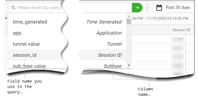- Click into the user interface query field to see a drop-down list of available field names for the selected log type. On the right-hand side of this drop-down list is the corresponding column name.