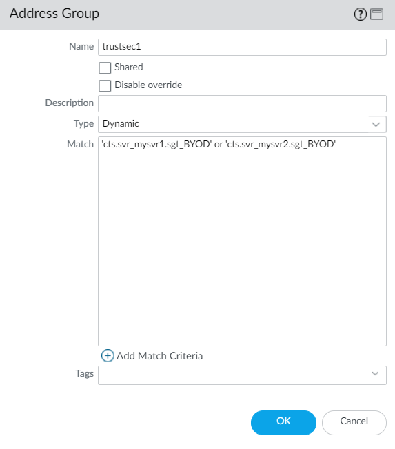 it to the dynamic address group.Panorama can only display security group tags it has learned from active sessions. Security group tags in live sessions appear in the match criteria list.