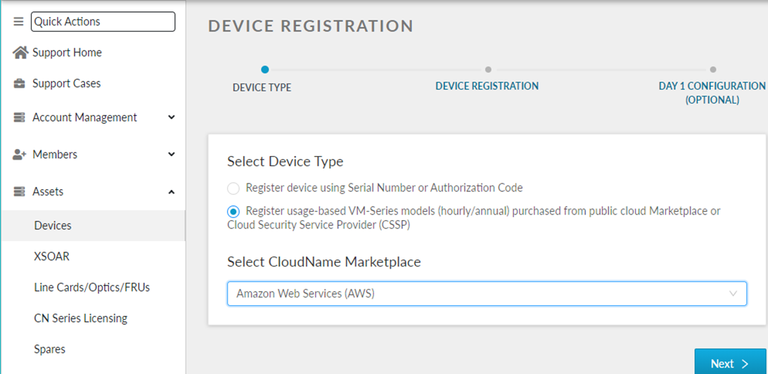 - Select Register usage-based VM-Series models (hourly/annual) purchased from public cloud Marketplace or Cloud Security Service Provider (CSSP).