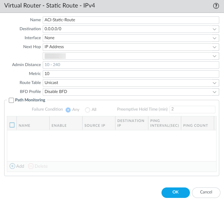 - Select IP Address from the Next Hop drop-down and enter the IP address of the next hop router.