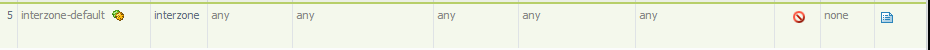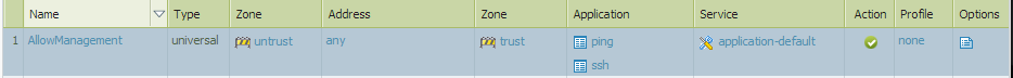 - Select PoliciesSecurity.In this example, we have four rules. A rule that allows management access to the firewall traffic, a rule to allow inbound traffic to the web server, a third rule to allow internet access to the web server, and in the last rule we modify a predefined intrazone-default rule to log all traffic that is denied.