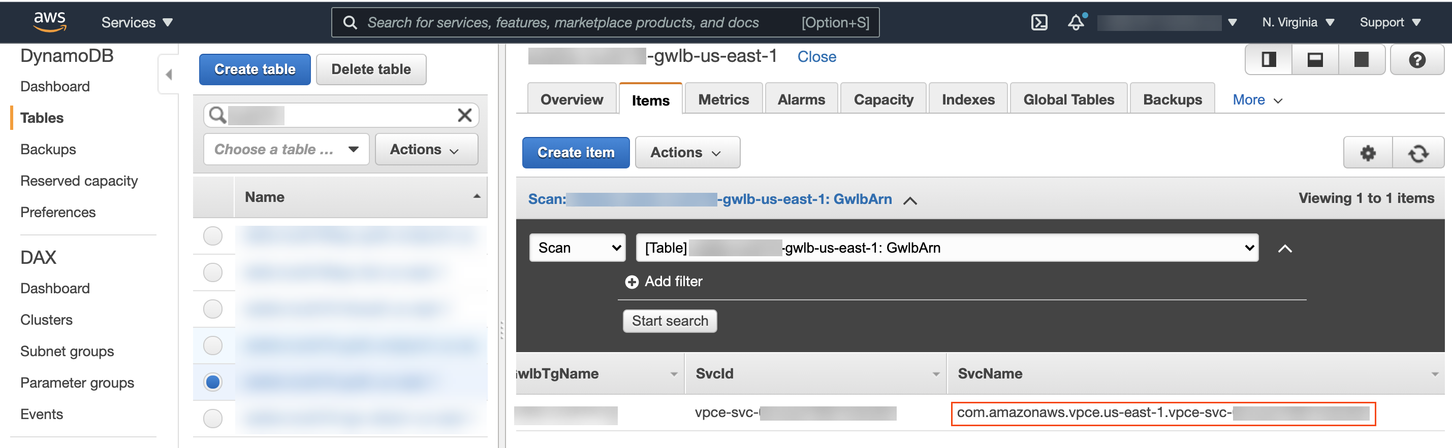 - Select Tables and locate your security VPC table. The table name will be <stack name>-gwlb-<region>. For example—cft-deployment-gwlb-us-east-1.