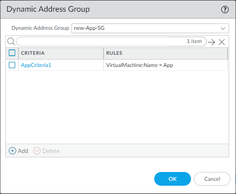 - Click Add to define the criteria associated with the chosen dynamic address group.