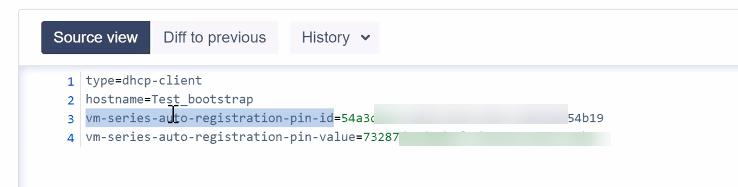 - Add the registration PIN ID and value in the init-cfg.txt file.In addition to the required parameters, you must include:vm-series-auto-registration-pin-id=vm-series-auto-registration-pin-value=