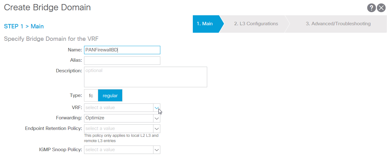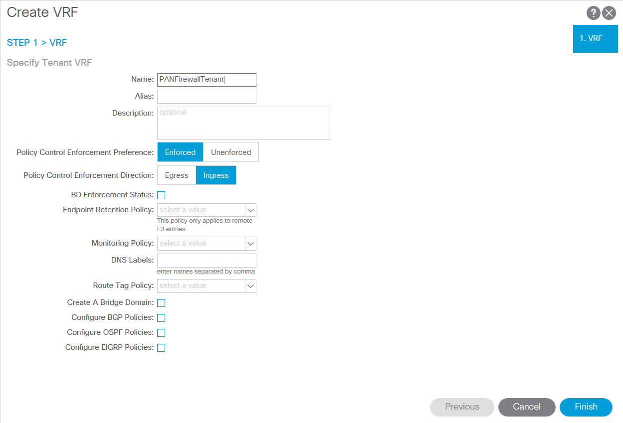 A tenant requires a VRF for all bridge domains and subnets. In this example, you will create a single, common VRF for the firewall and endpoints. Then configure a dedicated bridge domain for your firewall and disable dataplane learning. Disabling dataplane learning is required to use Policy Based Redirect in a bridge domain.