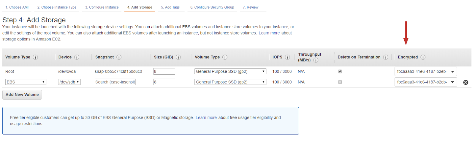 - Specify your EBS volumes- If you are using an unencrypted AMI, the encryption properties will be listed as Not Encrypted.