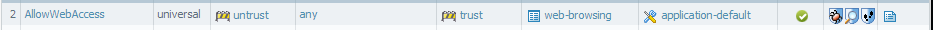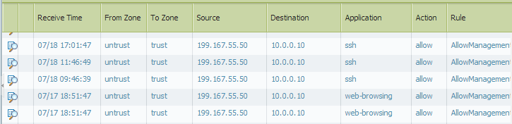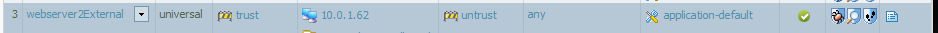 - Select PoliciesSecurity.In this example, we have four rules. A rule that allows management access to the firewall traffic, a rule to allow inbound traffic to the web server, a third rule to allow internet access to the web server, and in the last rule we modify a predefined intrazone-default rule to log all traffic that is denied.