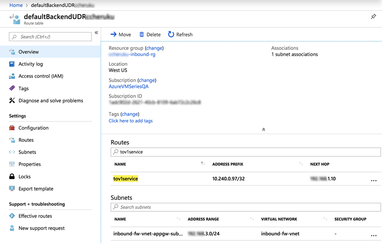 ILB behind the Application Gateway.In Azure, go to your inbound spoke resource group, view the route table and add a new route based on the destination service IP. In the following screen, the value in the tov1service ADDRESS PREFIX column is the service IP.