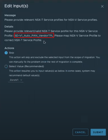 - Before moving to Migrate Configuration, you will be asked to provide a transport zone for the service insertion.