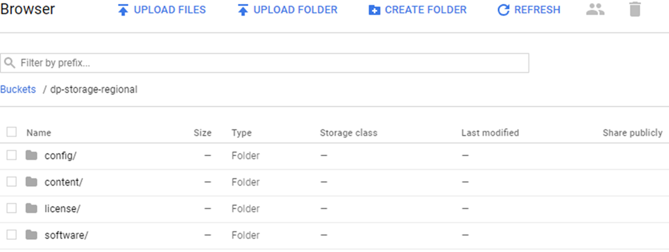 Select StorageBrowser, and click Create Bucket.You can use this bucket to bootstrap the firewall when you Deploy the VM-Series Firewall from Google Cloud Platform Marketplace.If you intend to bootstrap using a Google storage bucket in the same project, you must have devstorage.read_only IAM privileges.You can create and populate the bucket at the top level, or you can create a bucket with subfolders within it so that many bootstrap packages can share the same bucket.- Enter the bucket name, choose the default storage class, and choose a location. Note, the location in the storage bucket must be compatible with the zone you specify for the compute engine instance.Click Create.In the Storage Browser, click the bucket name to open it.Click Create Folder and name the folder config. Click Create.Repeat, creating folders for content, license, and software, as shown below. All folders must be present, even if they are empty.