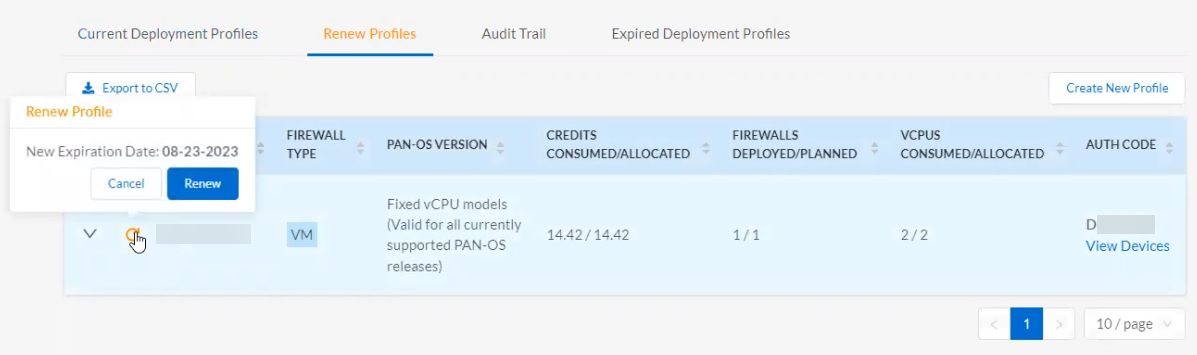 - Log in to the Palo Alto Networks Customer Support Portal.Select ProductsSoftware NGFW Credits.Locate the deployment profile to renew and click Details.Select Renew Profiles.Click the Renew icon and then click Renew to confirm.