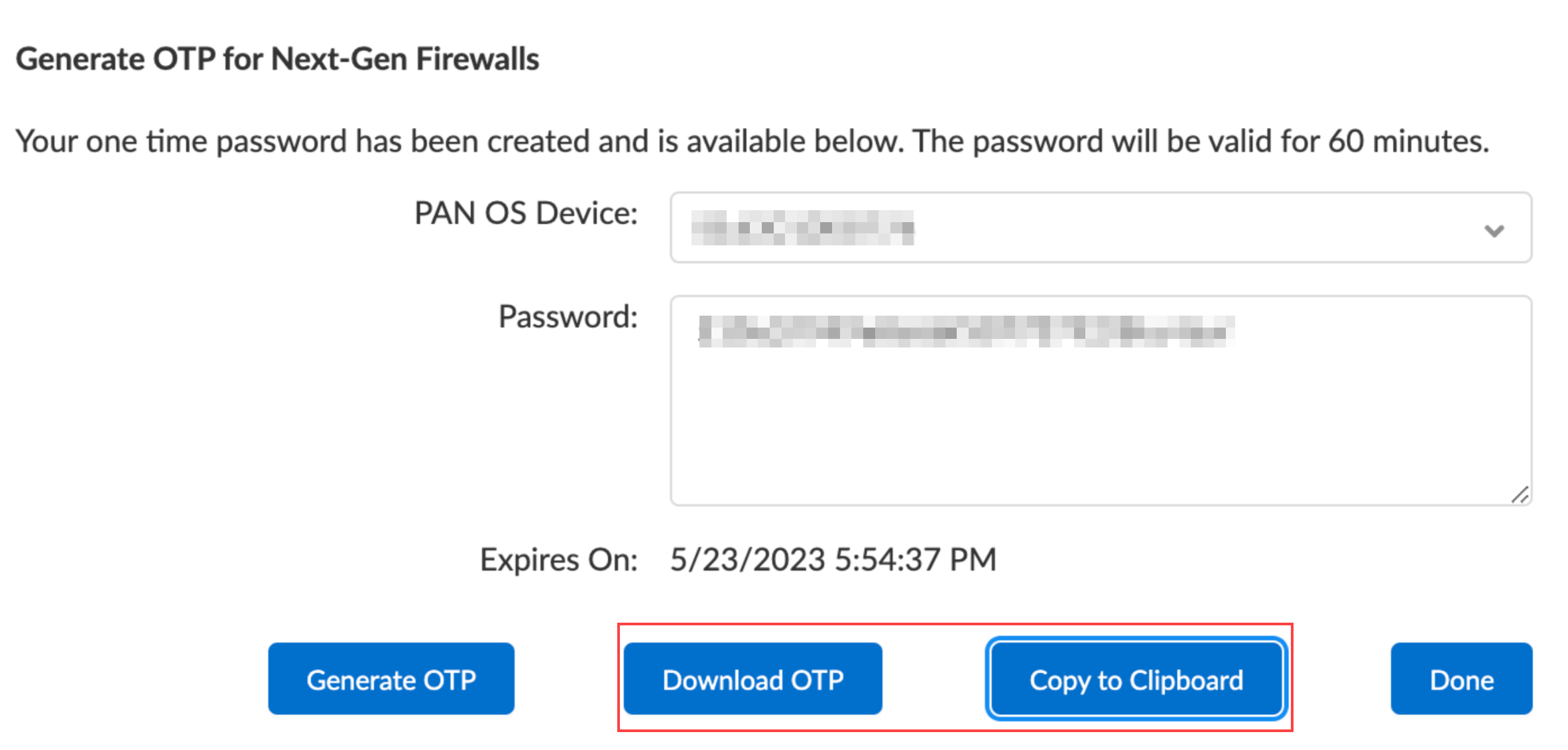 - Generate the One Time Password (OTP).OTP lifetime is 60 minutes and expires if not used within the 60 minute lifetime.Firewall may only attempt to retrieve the OTP from the CSP one time. If the firewall fails for any reason to fetch the OTP, the OTP expires and you must generate a new OTP.