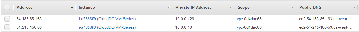 Select the Instance ID of the VM-Series firewall, and click Attach.Repeat steps 7 and 8 to attach the other network interface.Create an Elastic IP address and attach it to the firewall dataplane network interface that requires direct internet access.In this example, VM-Series_Untrust is assigned an EIP. The EIP associated with the interface is the publicly accessible IP address for the web server in the private subnet.- Select Elastic IPs and click Allocate New Address.Select EC2-VPC and click Yes, Allocate.Select the newly allocated EIP and click Associate Address.Select the Network Interface and the Private IP address associated with the interface and click Yes, Associate.In this example, the configuration is: