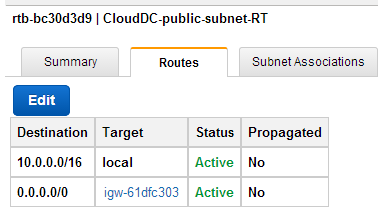 - From the VPC Dashboard, select Route Tables and find the route table associated with the public subnet.Select the route table, select Routes and click Edit.Add a route to forward packets from this subnet to the internet gateway. In this example, 0.0.0.0.0 indicates that all traffic from/to this subnet will use the internet gateway attached to the VPC.