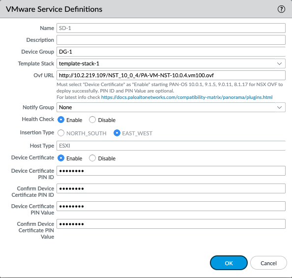 - Select the device group or device group hierarchy in the Device Group drop-down.Select the template stack in the Template drop-down.You cannot reuse a template stack or a device group assigned to one service definition in another service definition.Specify the location of the OVF file.Download the zip file, unzip it to extract and save the .ovf, mf and .vmdk files to the same directory. The ovf and vmdk files are used to deploy each instance of the firewall.Do not change the Panorama service definition OVF path after a successful NSX Service Deployment of VM-Series firewalls. Changing the OVF path, after a successful VM-Series firewall deployment, can result in a NSX Service Deployment failed state. You may resolve this failure in NSX-T Manager, however this may cause all VM-Series firewalls to redeploy.In OVF URL, add the location of the web server that hosts the ovf file. Both http and https are supported protocols.You can use the same ovf version or different versions across service definitions. Using different ovf versions across service definitions allows you to vary the PAN-OS version on the VM-Series firewalls in different ESXi clusters.(Optional) Select a Notify Group.Select East West as the Insertion Type for your firewall.(Optional) Enable Health Check.Health check is enabled by default. Also called service health check, this NSX-T feature allows you to simulate high availability in the case of a service instance failing. When configured with the VM-Series firewall, if a VM-Series service instance fails, any traffic directed to that firewall is redirect to another firewall instance in the cluster (for service cluster deployments) or a firewall instance on another host (for host-based deployments).You cannot disable or enable Health Check in a service definition after committing and deploying VM-Series firewalls in NSX-T. Attempting to commit a change in the Health Check configuration returns commit failure. To change this, you must delete and recreate your service definition and redeploy your VM-Series firewalls.To automatically retrieve a device certificate when the VM-Series firewall is deployed by NSX Manager, configure the device certificate.Enable this option to apply a device certificate to newly deployed VM-Series firewalls. Only use this option when deploying the firewall using a base image OVF that supports device certificates. Panorama pushes the device certificate information to NSX Manager as part of the service definition. When a new firewall is deployed in NSX, the device certificate is installed on the firewall at bootup.For list of OVFs that support device certificates for the VM-Series firewall on VMware NSX, see the Palo Alto Networks Compatibility Matrix.If your OVF does support a device certificate, you must Enable device certificates regardless of whether or not you are using a device certificate. If your OVF does not support a device certificate, disable this option.