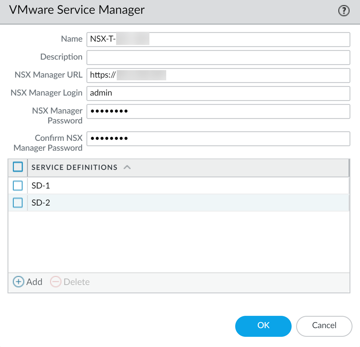 Attach the service definition to the service manager.You cannot use a service definition in more than one service manager.- Select PanoramaVMwareNSX-TService Manager and click the link of the service manager name.Under Service Definitions, click Add and select your service definition from the drop-down.Click OK.