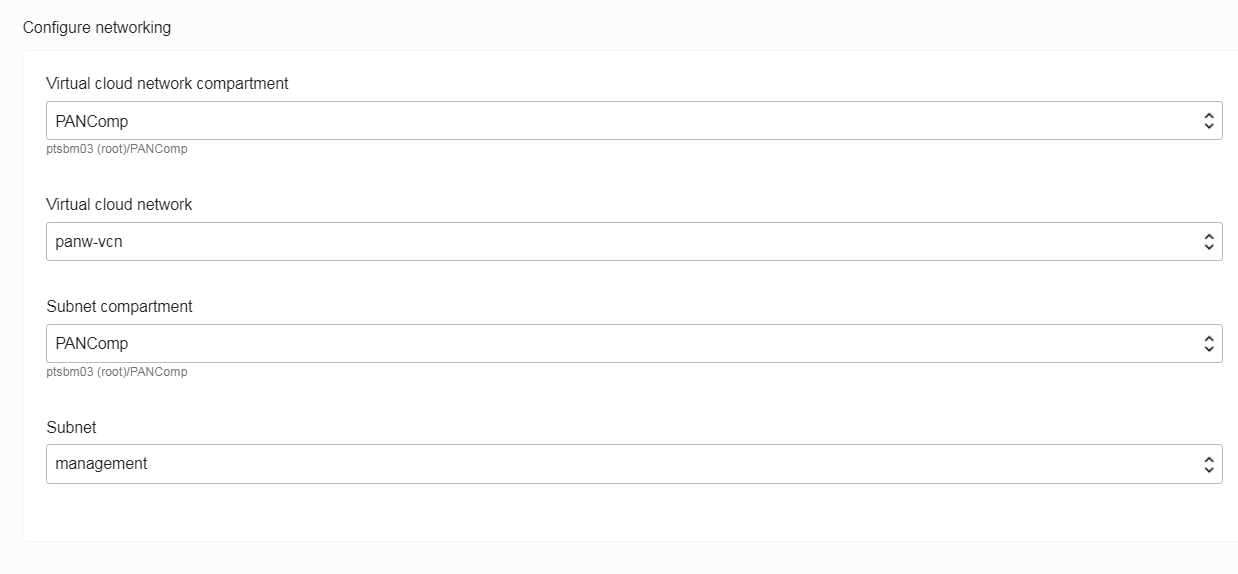 Under Networking, select your Virtual cloud network compartment, Virtual cloud network, Subnet compartment, and Subnet for your management interface. You can only add one interface when creating the VM-Series firewall instance. You will add additional interfaces later.