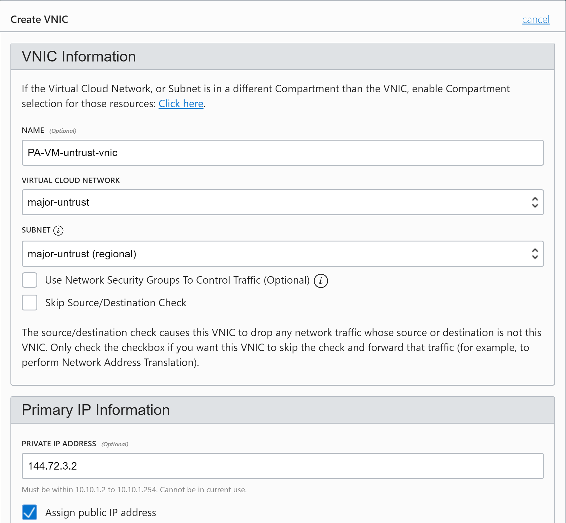 - Select your newly launched VM-Series firewall instance and select Attached VNICsCreate VNIC.Enter a descriptive Name for your vNIC.Select your VCN from the Virtual Cloud Network drop-down.Select your subnet from the Subnet drop-down.Specify a Private IP Address. This is only required if your want to choose a particular IP for the vNIC. If you do not specify an IP, OCI will assign an IP address from the CIDR block you assigned to the subnet.Select Assign Public IP Address for public facing vNICs such as your untrust subnet.Click Create VNIC.Repeat this procedure for each vNIC your deployment requires.