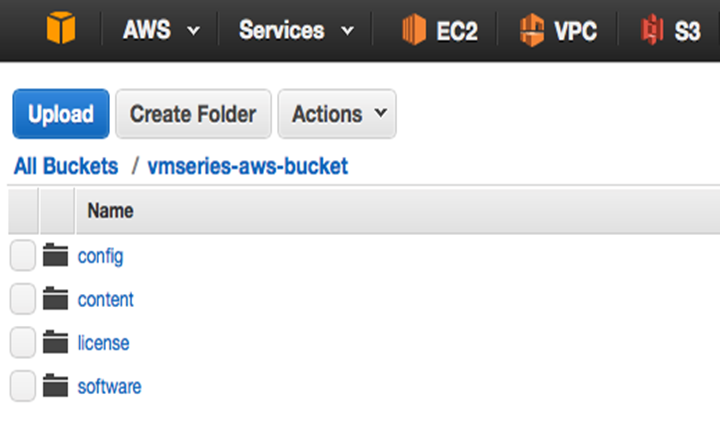 Prepare an S3 bucket, and an IAM role to enable read access.To bootstrap using a file, you must be familiar with AWS S3 and IAM permissions required for completing this process. For detailed instructions on creating policy, refer to the AWS documentation on Creating Customer Managed Polices.The management interface of the VM-Series firewall must be able to access the S3 bucket to complete bootstrapping. You can either assign a public IP address or an elastic IP address to the management interface so that the S3 bucket can be accessed over the Internet. Or, create a AWS VPC endpoint in the same region as the S3 bucket, if you prefer to create a private connection between your VPC and the S3 bucket and do not want to enable internet access on the firewall management interface. For more information refer to the AWS documentation on setting up VPC endpoints.- Create an IAM role with inline policy to enable read access to the S3 bucket [ListBucket, GetObject]. For detailed instructions on creating an IAM role, defining which accounts or AWS services can assume the role, defining which API actions and resources the application can use upon assuming the role, refer to the AWS documentation on IAM Roles for Amazon EC2. When launching the VM-Series firewall, you must attach this role to enable access to the S3 bucket and the objects included in the bucket for bootstrapping successfully.On the AWS console, create an Amazon Simple Storage Service (S3) bucket, or create a subdirectory in an existing S3 bucket.The S3 bucket in the following example, vmseries-aws-bucket, is at the All Buckets root folder level.