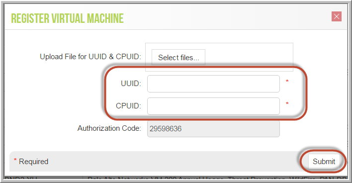 Enter the UUID and CPUID of the VM instance and click Submit. The portal will generate a serial number for the firewall.