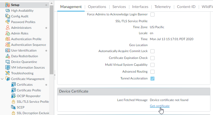 Click OK to save your configuration changes.Select Commit and Commit and Push your configuration changes to your managed firewalls.Select SetupManagementDevice Certificate and Get Certificate.