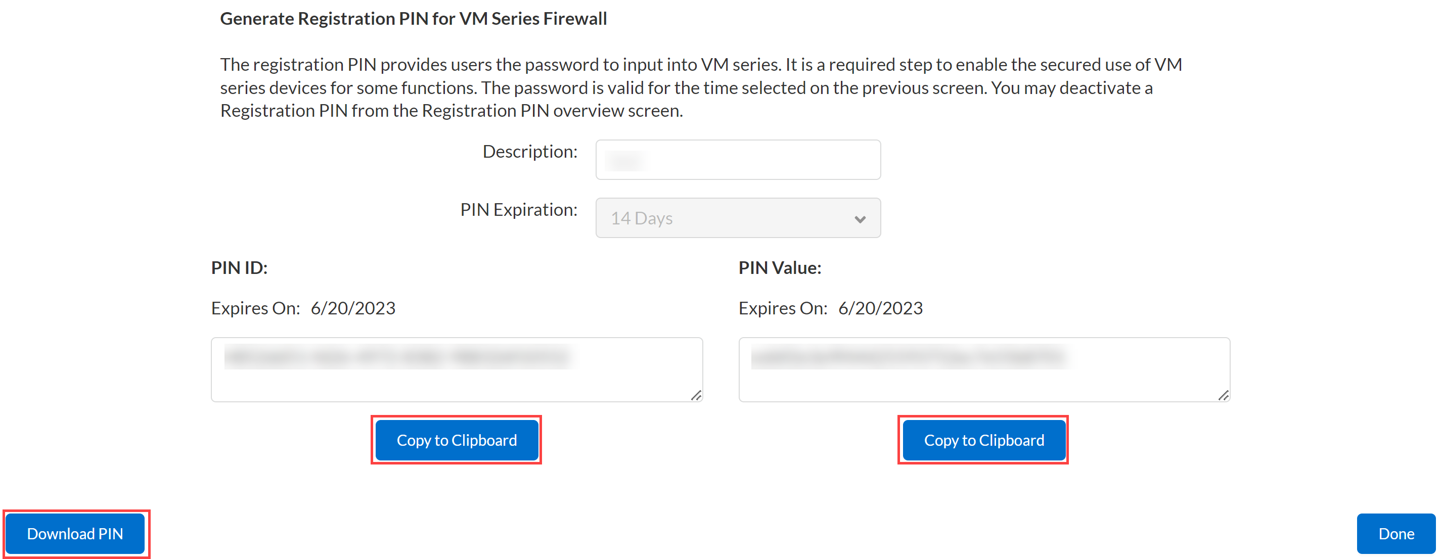 - Select AssetsDevice Certificates and Generate Registration PIN.Enter a Description and a PIN Expiration time period.Click Generate Registration PIN.Save the PIN ID and value.Make sure to launch the firewall before the PIN expires.