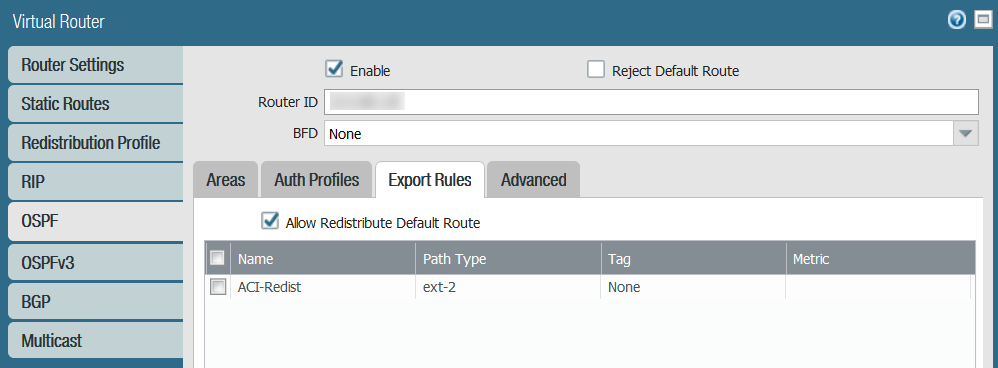 Configure OSPF.- Select NetworkVirtual Routers and click on the virtual router you created earlier.Select Router SettingsECMP and select Enable.Select OSPF and choose Enable.Enter the OSPF Router ID.Under Area, click Add.Enter the Area ID. This value must match the value you assigned when you created the external routed network on the APIC. On the firewall, this must be entered in dotted decimal form. For example, if you entered an Area ID of 10 in the APIC, the equivalent on the firewall is 0.0.0.10.Select InterfaceAdd.Enter the interface that connects to your external network EPG and click OK.Select Export RulesAdd.Select the Redistribution Profile you created above from the Name drop-down and click OK.Select Allow Redistribute Default Route.Click OK.