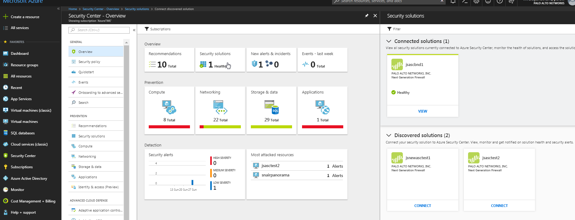 When Azure Security Center detects that you have deployed the VM-Series firewall within the Azure subscription, it displays the firewall as a security solution. You can then connect the VM-Series firewall to Security Center using the Common Event Format (CEF) over Syslog, and view firewall logs as alerts on the Security Center dashboard.- Log in to your Azure portal and access the Security Center dashboard.Select Security Solutions to view all available VM-Series firewalls within this Azure subscription.