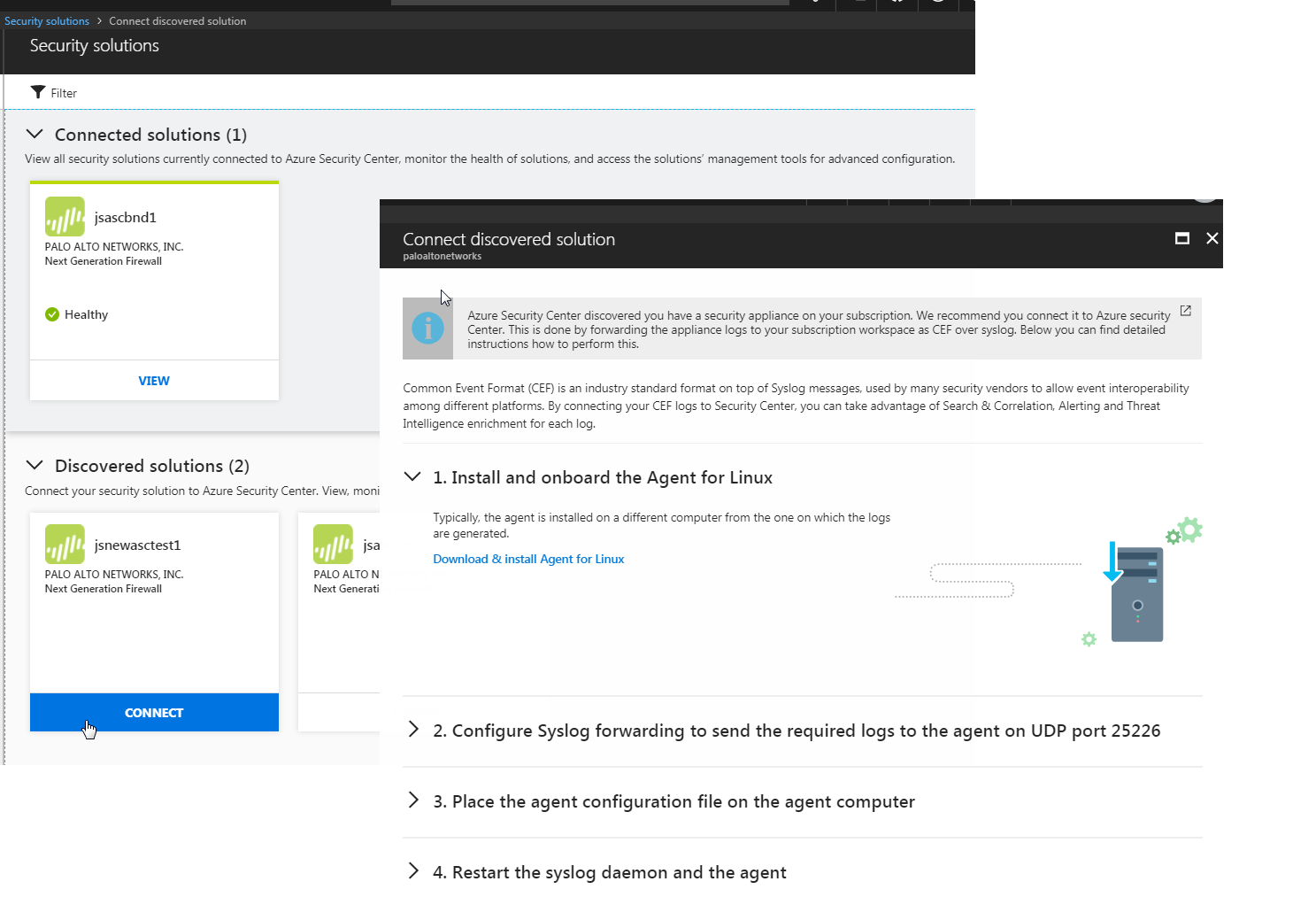 Expand Discovered solutions, and select the VM-Series firewall instance that is in the same resource group as the workload you want to secure and click Connect.To view firewall logs as alerts on the Security Center dashboard, you need to follow the four-step process that displays on screen.