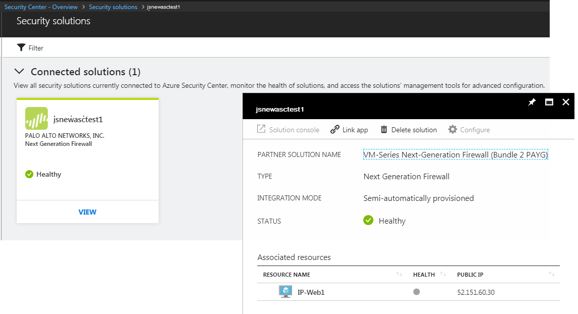 On successfully connecting the VM-Series firewall to Security Center, the VM-Series firewall displays in the Connected solutions list.Click View to verify that the firewall is protecting the workload that you need to secure.