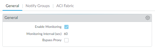 - Select PanoramaCisco ACISetupGeneral.Select Enable Monitoring. This enables monitoring for all clusters in your deployment.Set the Monitoring Interval in seconds. The monitoring interval is how often Panorama retrieves updated network information from the APIC. The default value is 60 seconds and the range is 60 seconds to 86,400 seconds (one day).(Optional) Select Bypass Proxy to Bypass proxy server settings, configured on Panorama under PanoramaSetupServicesProxy Server, for communication between Panorama and the APIC. This allows Panorama to communicate directly with the APIC while maintaining proxied communication for other services.