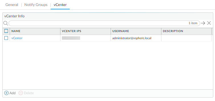 Configure up to 16 Monitoring Definitions.A vCenter instance can be assigned to only one Monitoring Definition.- Select PanoramaVMware vCenterMonitoring Definition and click Add.Enter a descriptive Name and optionally a description to identify the vCenter for which you use this definition.Select the vCenter and Notify Group.Click OK.
