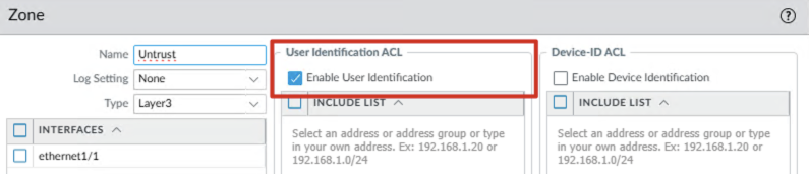 7. Enable the user identification on the zone.