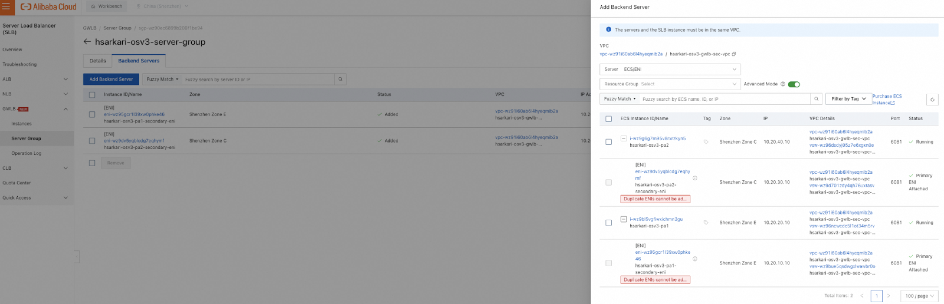 5. Append and toggle Advanced Mode to see the secondary NICs of the firewall and set the Server Type in the Add Backend Server panel. You may choose to set Server Type to ECS/ENI.