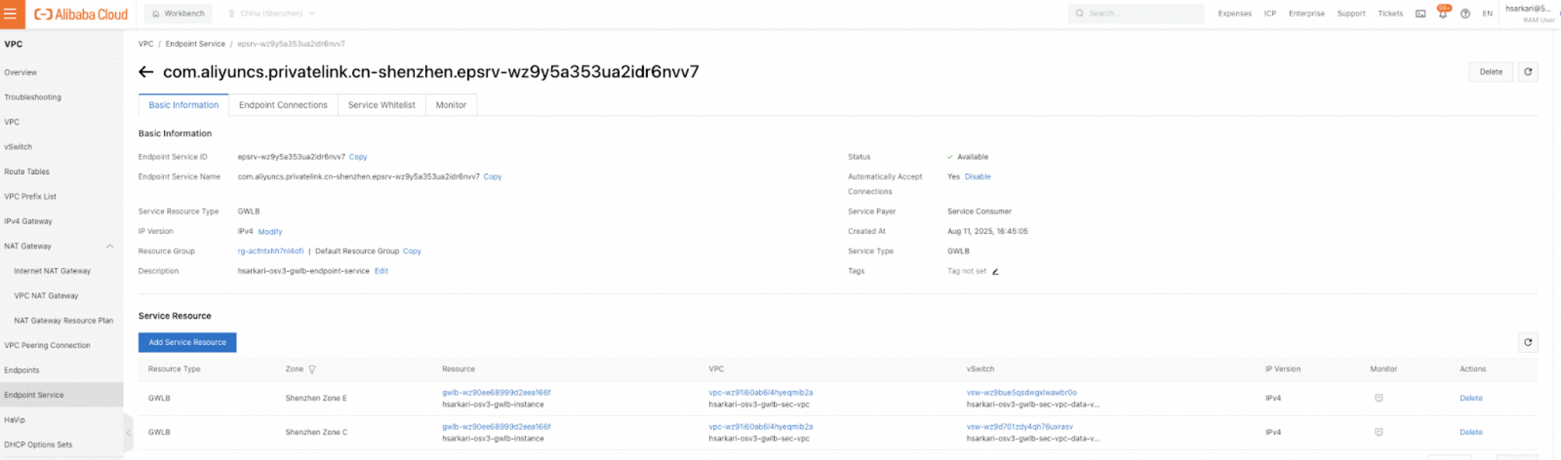Service Resource TypeSelect the type of the service resource that you want to add to the endpoint service. For example, GWLB.