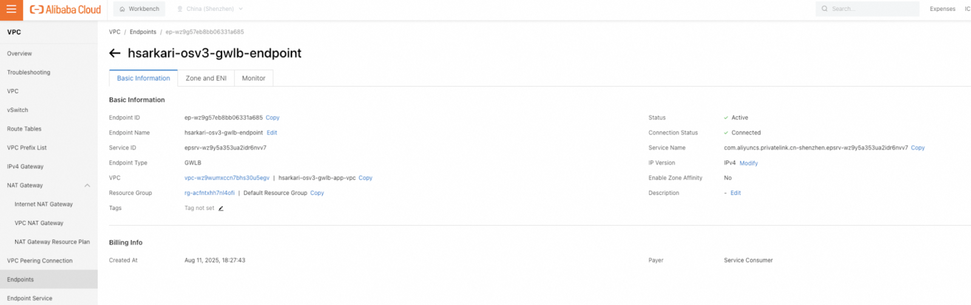 Zone and vSwitchSelect the zone where the service resource of the endpoint service is deployed and select the vSwitch in this zone. The system automatically creates an endpoint elastic network interface (ENI) in the vSwitch. For example, you may choose to select Ulanqab Zone B and the vSwitch of the GWLB endpoint subnet.